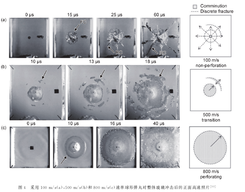 依据1.4节中的讨论,弹击动态加载情况下,材料力学参数和实际防弹性能存在不一致的现象;此外也通过冲击实验理解了蓝宝石作为迎弹面材料防弹性能不如多晶陶瓷的原因。而在本节中,将继续通过其他研究者对透明装甲破坏行为的研究,进一步理解不同材料、不同结构装甲在高应变速率下的裂纹形核、拓展,缺陷影响,和材料失效情况等。